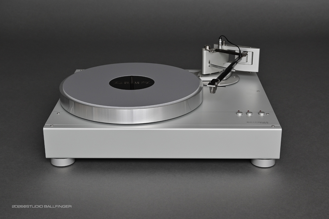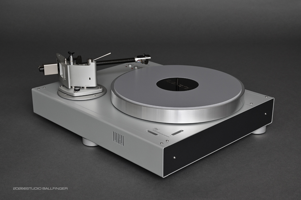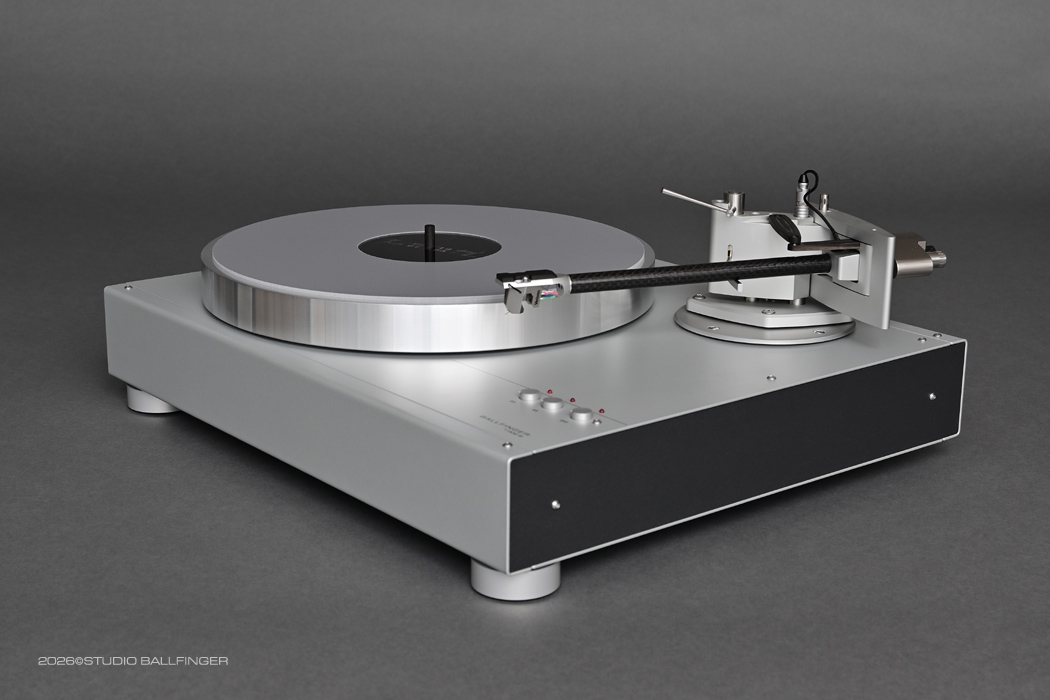 The turntable is driven by a synchronous motor that follows a high-precision, electronically generated sinusoidal voltage. These synchronous motors are manufactured to the highest possible standards of smoothness and are subsequently selected. The motor power is transmitted to the sub-platter via a precision-ground flat belt. The platter bearing has a diameter of 10 mm and consists of a precision-ground, specially hardened steel shaft that rotates in a bronze bushing. Axial support is provided by a ceramic ball that runs on a ring-shaped Delrin bearing. This special bearing arrangement generates precisely defined friction. All components are precisely coordinated, resulting in a speed deviation of 0.020%.