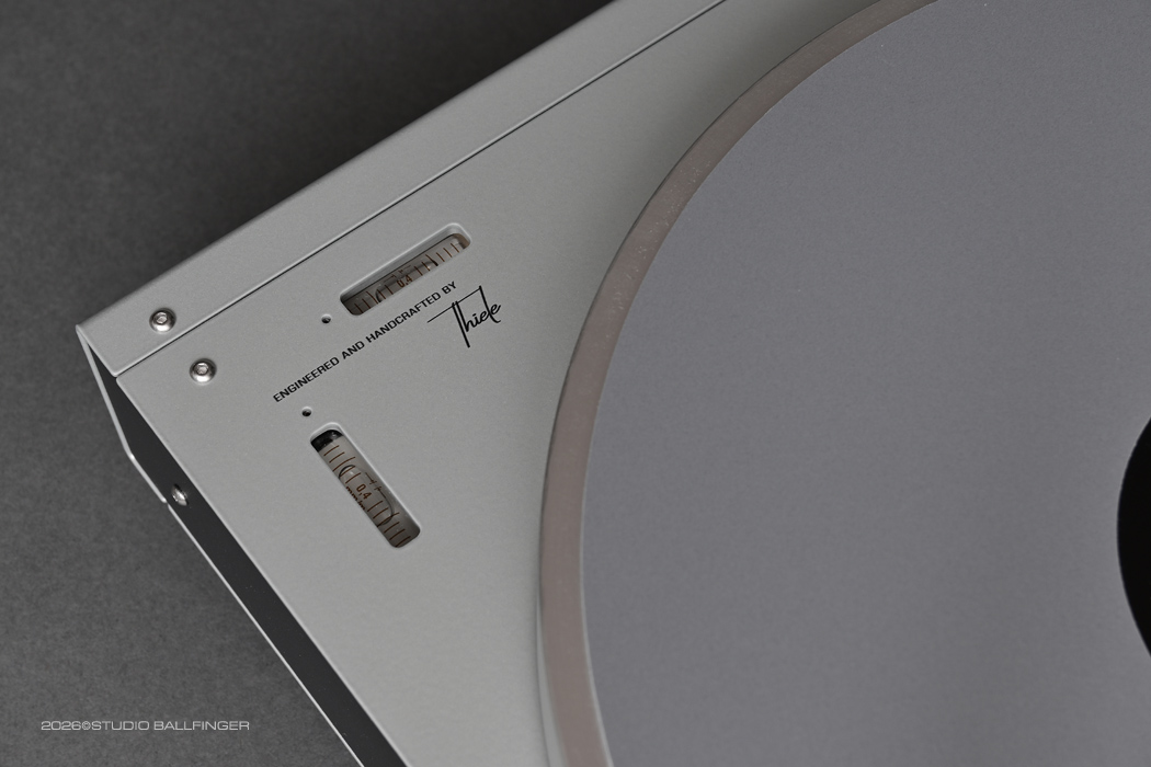 The chassis consists of a solid, cross-laminated bamboo block that effectively dissipates unpleasant resonances. Bamboo has a cellular structure with air spaces between long, parallel fibers. This structure acts as a natural shock absorber and dampens unwanted vibrations and resonances more effectively than many hardwoods. Thanks to the cross-lamination and the varying orientation of the fibers within the layers, sound-detrimental vibrations are dissipated and neutralized more quickly. Additionally, a solid damping weight is invisibly embedded within the block, set in place using a precisely defined, permanently elastic plastic compound. This forms the foundation for a clean sound image with razor-sharp definition. Two high-precision spirit levels are embedded in the upper left corner. With the help of the three height-adjustable feet, the player can be precisely leveled. This precise, horizontal alignment is necessary for the proper operation of the Thiele TA01 tone arm.