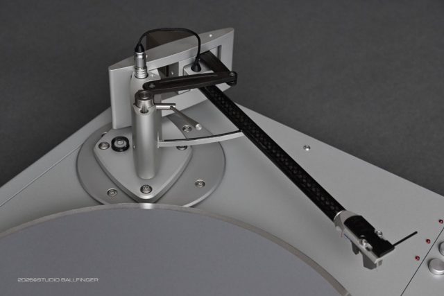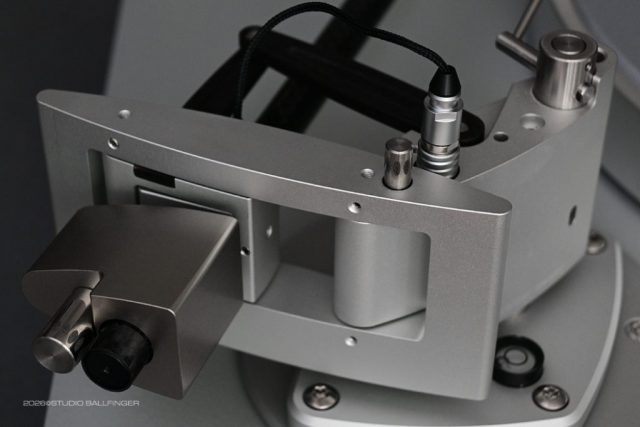 Zavfino Crossbow TZ-1: On this tonearm, the housing, tonearm tube, and headshell are made of 6061 aluminum and finished with a ceramic coating; the vertical bearing housing is also made of 6061 aluminum. The enlarged mounting base is likewise constructed from 6061 aluminum. The counterweight rod is made of precision-machined SUS-303 stainless steel and is silicone-damped. The TZ-1 utilizes a high-precision miniature needle bearing. The vertical bearing housing is solidly constructed, and the bearing thickness is 16.2 mm. The oil/gel-based damping effectively reduces vibrations and contributes to tracking stability even during challenging passages on the record. With an effective mass of 15 g, the TZ-1 has a recommended stylus compliance of ~20 μm/mN. For this tonearm, we recommend the Ortofon MC 90X.